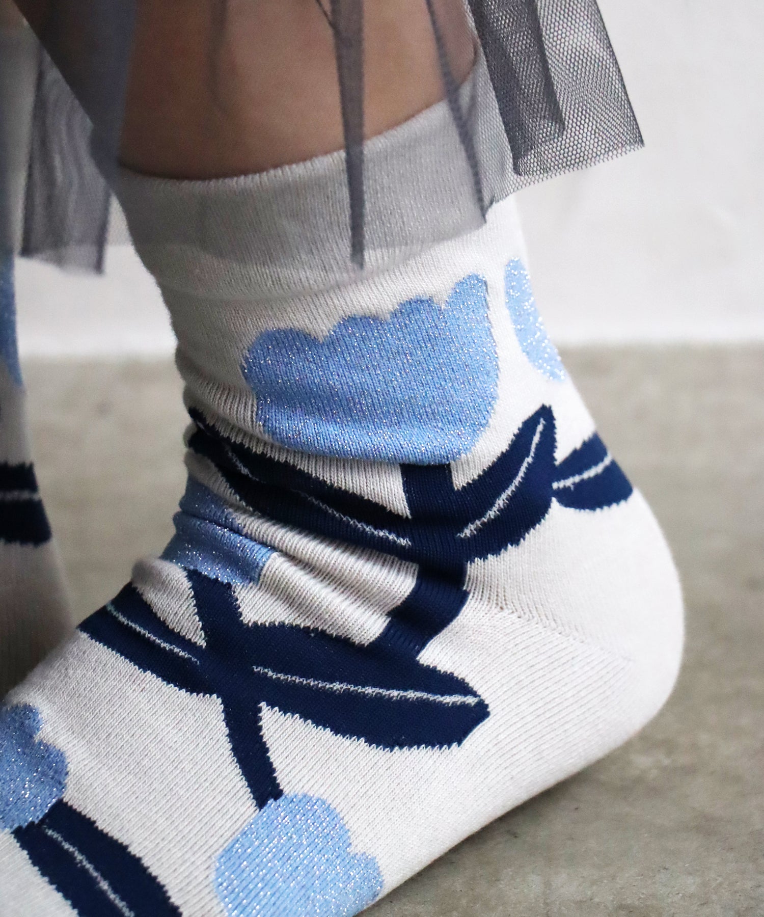 鮮やかな青色と上品なライトグレーをベースに、花モチーフを散りばめました。